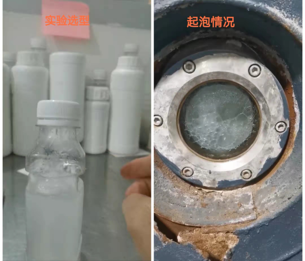 我公司在收集相關信息并取得水樣后立即安排實驗選型,通過與客戶溝通安排由實驗選出的三款消泡劑上機小試,最終確定出最優產品。最終,公司MOVER-1312TP型號蒸發專用消泡劑的上機效果出眾,高出客戶預期,成功解決多效蒸發起泡問題。