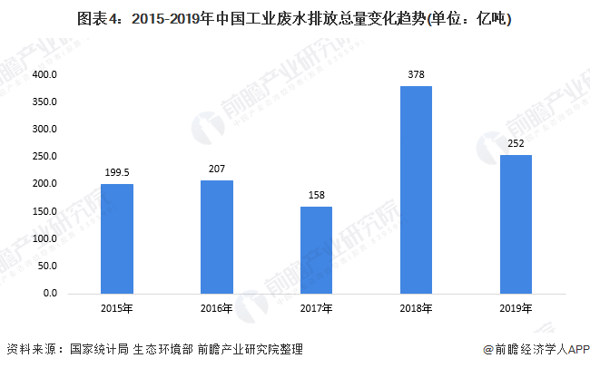 由于國家統(tǒng)計局于2015年以后停止公布工業(yè)廢水總排放量數(shù)據(jù),前瞻結(jié)合2016-2019年我國工業(yè)廢水直排海排放量的增速測算,估計2019年我國工業(yè)廢水總排放量約為252億噸。