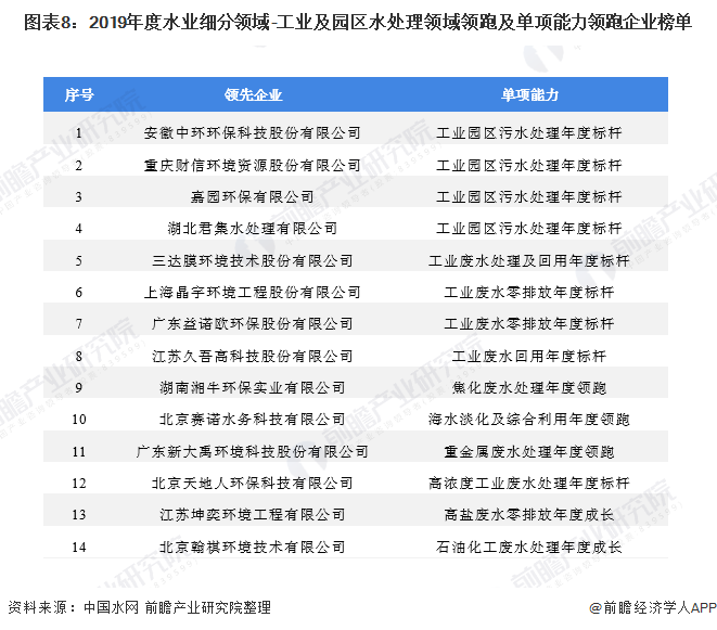 據(jù)中國水網(wǎng)公布的2019年度水業(yè)細分領(lǐng)域-工業(yè)及園區(qū)水處理領(lǐng)域領(lǐng)跑及單項能力領(lǐng)跑企業(yè)榜單顯示,共有14家企業(yè)入圍“領(lǐng)跑企業(yè)榜單”,具體如下表所示: