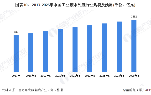 據(jù)GEP Research的研究數(shù)據(jù)顯示,2017年,我國工業(yè)廢水處理行業(yè)的市場規(guī)模約為889億元。根據(jù)市場發(fā)展情況結(jié)合政策支持情況,在“十三五”期間,我國的工業(yè)廢水處理市場規(guī)模迅速增長;“十四五”期間,隨著環(huán)保治理的不斷深入,工業(yè)廢水處理行業(yè)仍將保持穩(wěn)定增長,保守估計到2025年,工業(yè)廢水市場規(guī)模將將達到1262億元。
