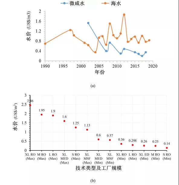 (a)所示的海水和苦咸水淡化的平均成本趨勢