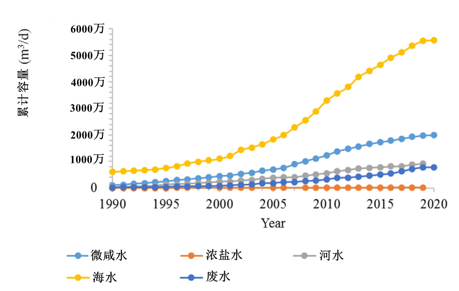 由于全球對性價比高的清潔水生產的需求,導致了海水淡化產業化的快速發展。1990年至2020年2月中旬,全球脫鹽水生產安裝容量為9 720萬m3·d-1,其中以海水為給水水源的淡化容量為5540m3·d-1,占比約為57%。