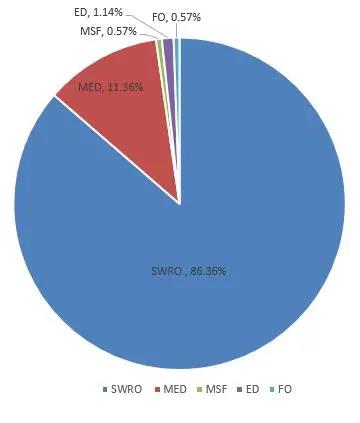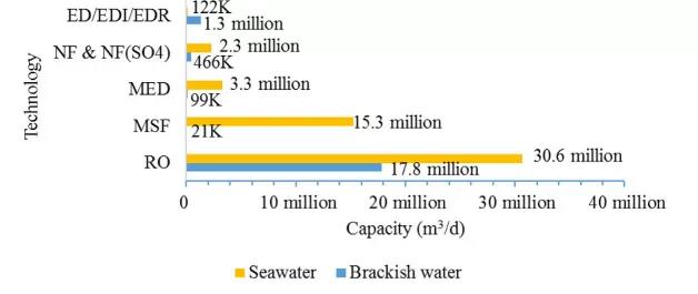 圖2顯示了不同技術(用于處理不同的給水來源)對全球脫鹽能力的貢獻情況。