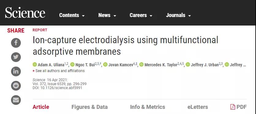 最重要的是,該海水淡化膜在水中和高溫條件下都具有良好的穩定性,并且可以重復使用,為高效制備飲用水提供了新思路。研究成果以“Ion-capture electrodialysis using multifunctional adsorptive membranes”為題,于4月16日發表在《Science》上!