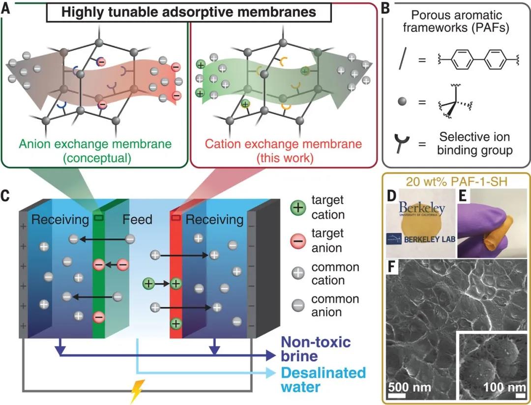 研究人員將嵌入PAF納米粒子的薄膜納入電滲析系統用于海水淡化。當施加電壓驅動水中的離子通過薄膜時,不僅鈉離子與氯離子能夠與水分離,同時嵌在膜上的納米粒子還能夠捕獲特定的目標金屬粒子(如Fe2+, Hg2+)及其他有害物質。