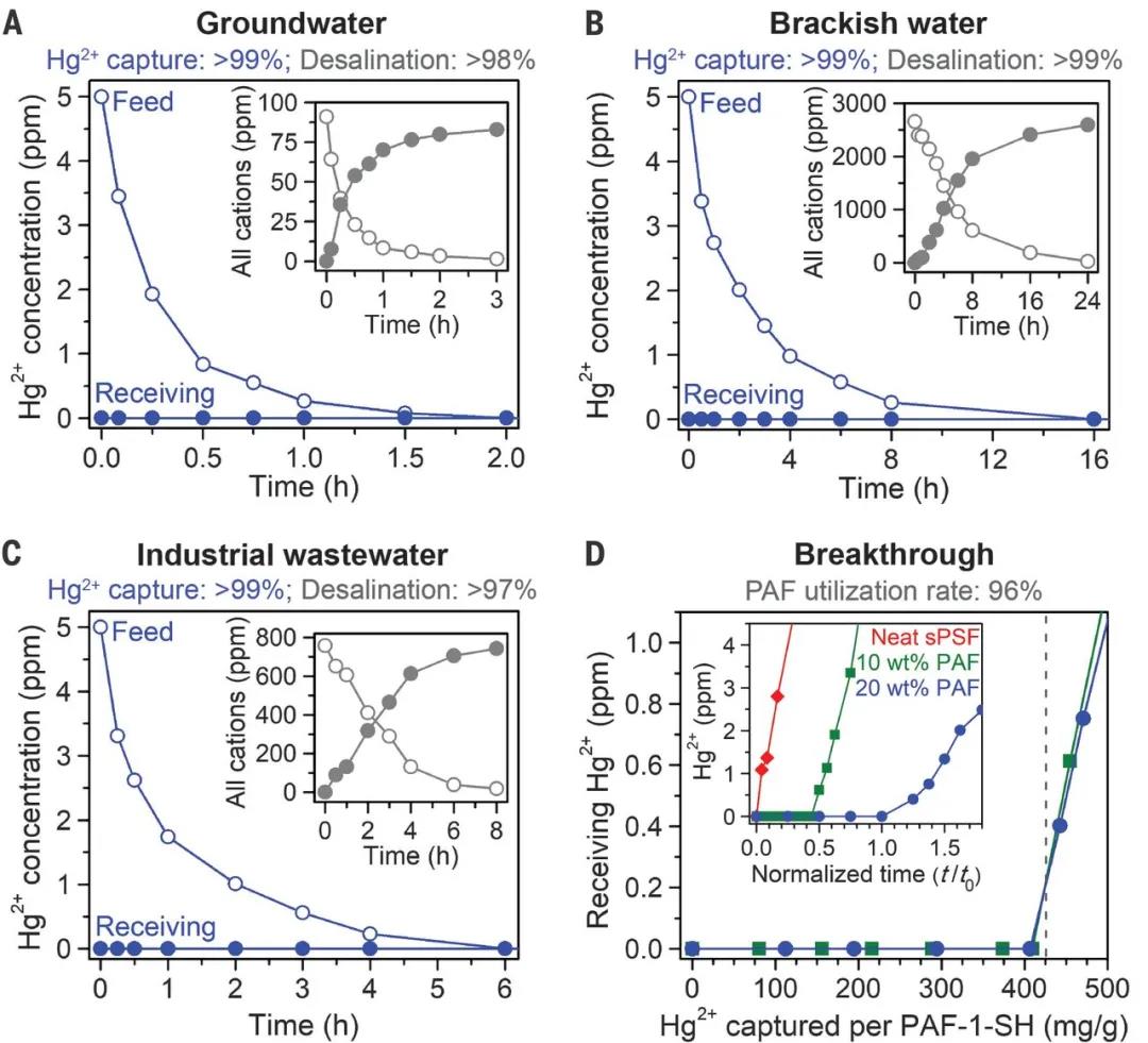 比如,為了捕獲汞,研究人員將附著了硫醇的PAF納米粒子嵌入離子交換膜,制備了對汞具有高選擇性的聚合物膜。測試結果表明,一公斤的膜材料可以100%去除含Hg2+濃度為5 ppm的35000升水中的所有汞。